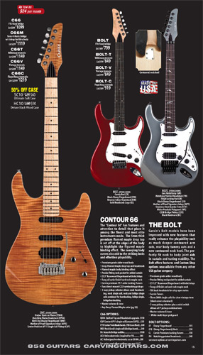 The popular Bolt and Contour 66 bolt neck guitars were still offered, but not for much longer. By the end of the year, they would be replaced by the Aries 6-string and 7-string bolr-neck guitars. The Aries Series weren't ready for inclusion in the 2015 catalog, and as time went by, and 8-string model would be added, as well as neck-through models and multiscale models.