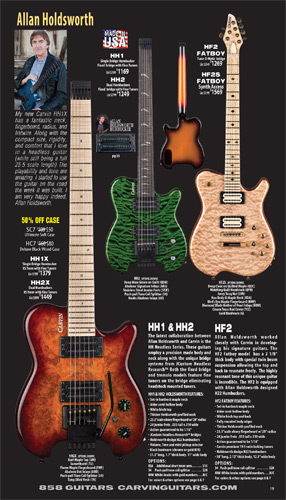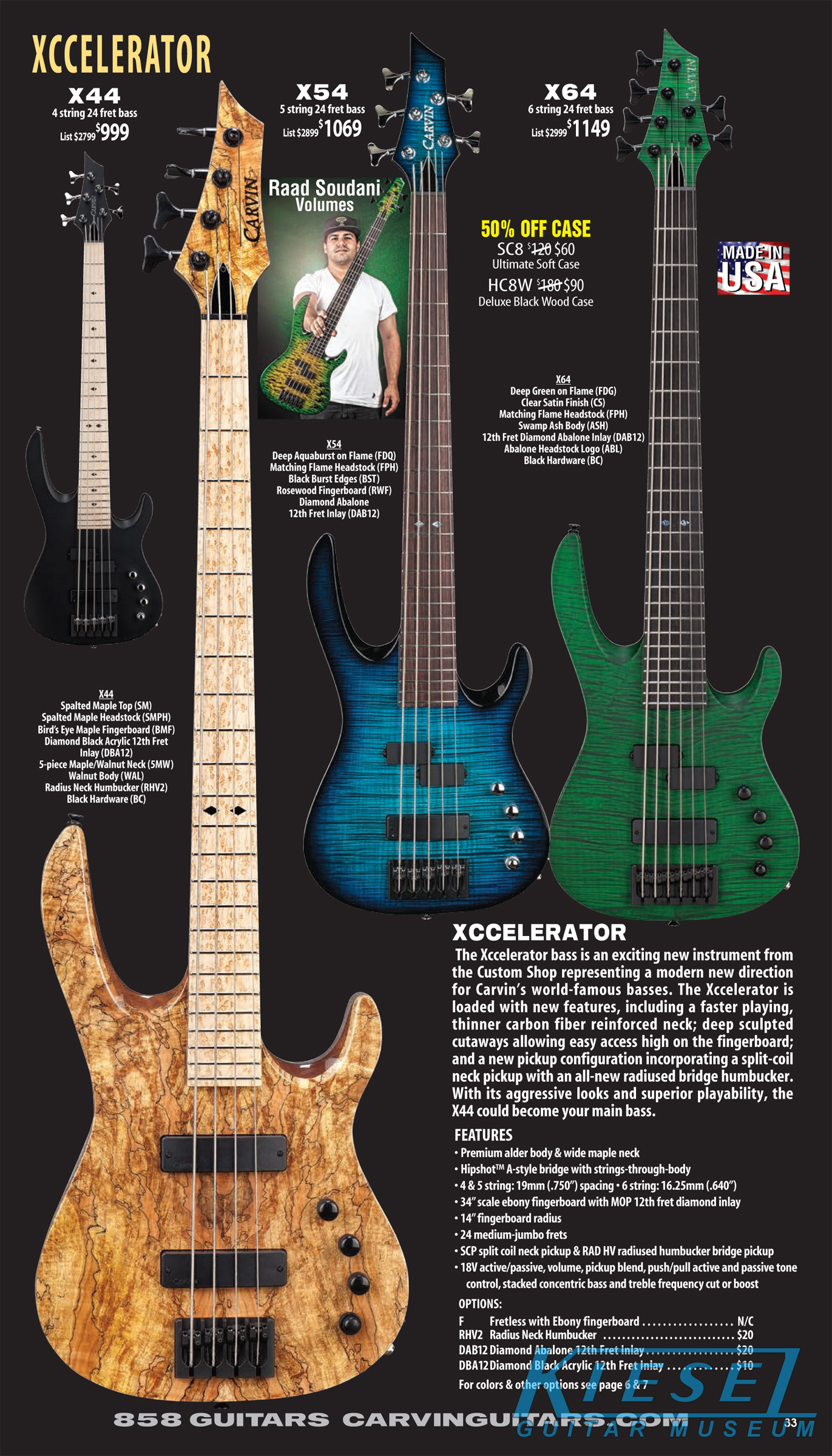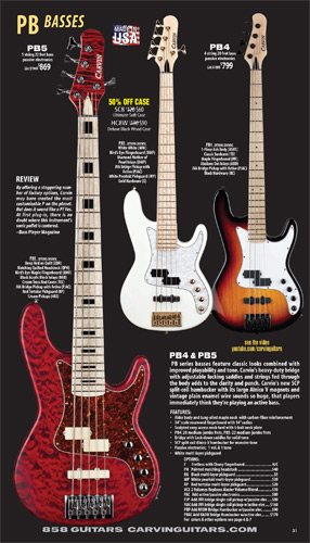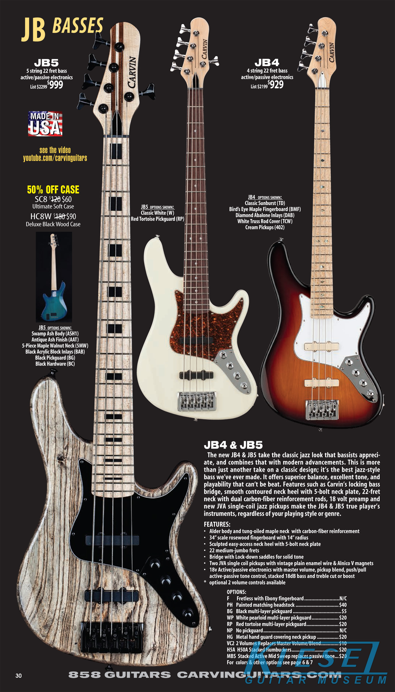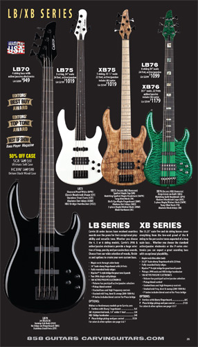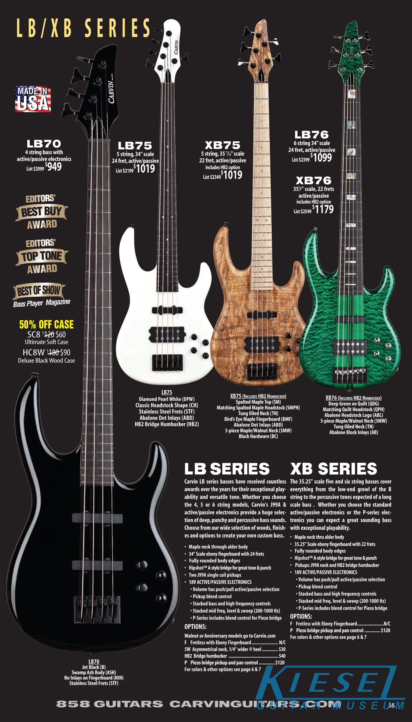 The passive LB20 remained Carvin's lowest-priced bass. The catalog showed a Pearl Blue LB20F fretless, with white fretlines on the fingerboard. Behind it is the standard LB20 in Classic White with matching headstock. Base price on this was $519.