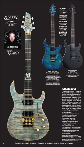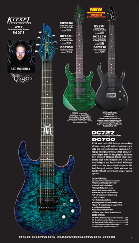 The DC600 was a traditionally-designed model, which would eventually replace the venerable DC127. Like all DC models, it was a neck-through instrument, available to order with any of Kiesel's woods, finishes and other options. A signature DC600-based model, the Lee McKinney LPM6, was also available, and featured Lee's custom inlays. There were 7 and 8-string mocels offered; the DC700 and DC800. The DC700 had a standard 25.5" scale length, while the DC800 featured an extended scale length of 27". An extended scale DC700 was also offered as the DC7X, and a 7-string version of the Lee McKinney Signature model, the LPM7, was available. 6, 7 and 8-string DC Series models are still availble to order here.