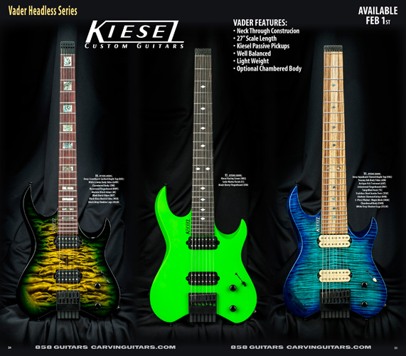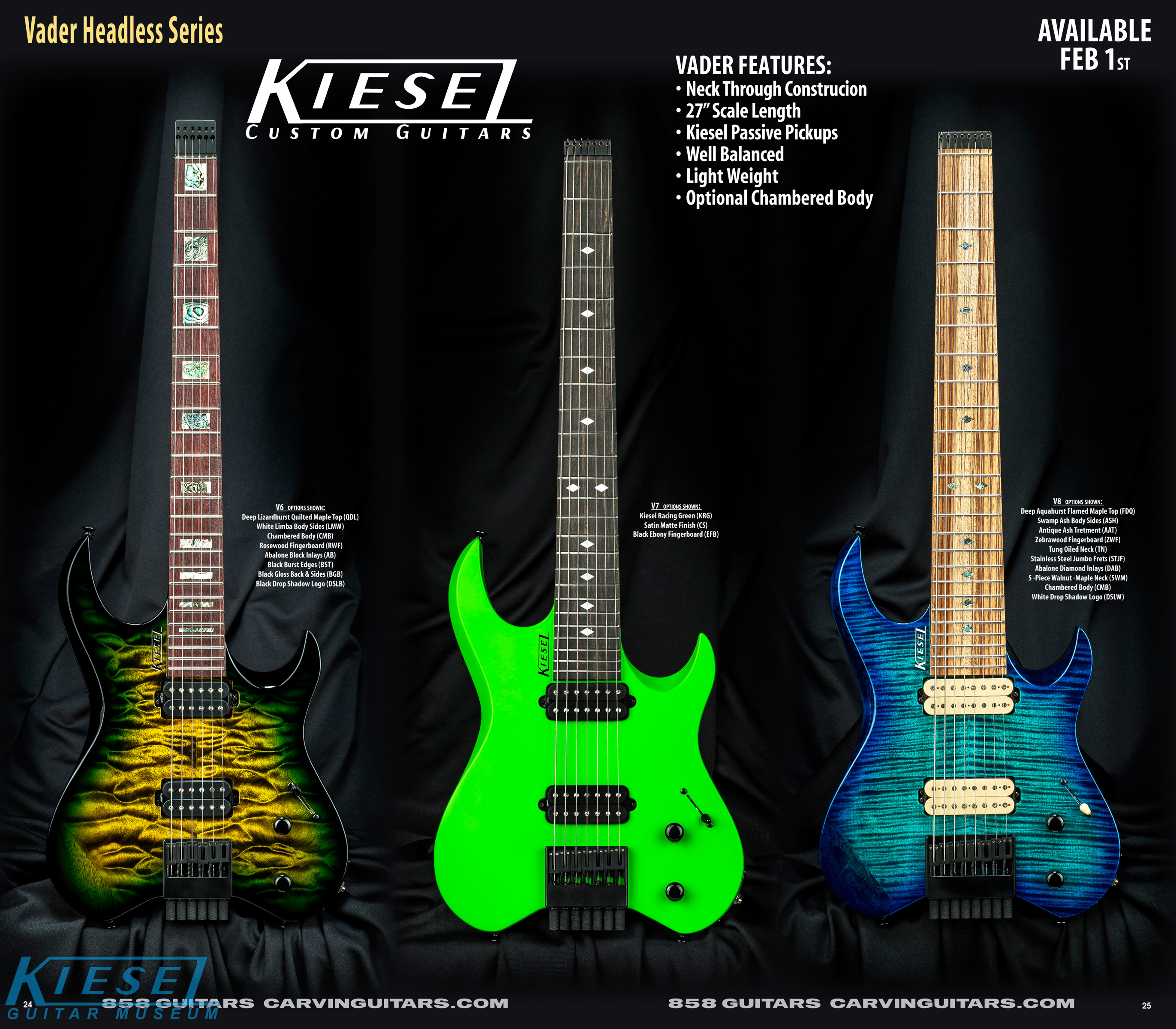 The really big news for 2015 (apart from the formation of Kiesel Guitars as a separate entity) was the introduction of the Vader Series headless guitars. Kiesel had offered a headless model for a number of years, the Allan Holdsworth HH2, but the Vader was significantly different. It sported a much more aggressive body shape, and was available in 6, 7 or 8 string configurations. Initially, the Vader Series was only offered with a Hipshot hardtail headless bridge, but Kiesel would work with Hipshot to develop a headless tremolo that would be used on the Vader Series, Holdsworth headless, and future headless guitars. The Vader Series would prove to be one of the most popular models to ever come out of the Custom Shop, and would receive numerous awards and accolades after its intruduction. The Vader Series guitars are still available from Kiesel Guitars right here.
